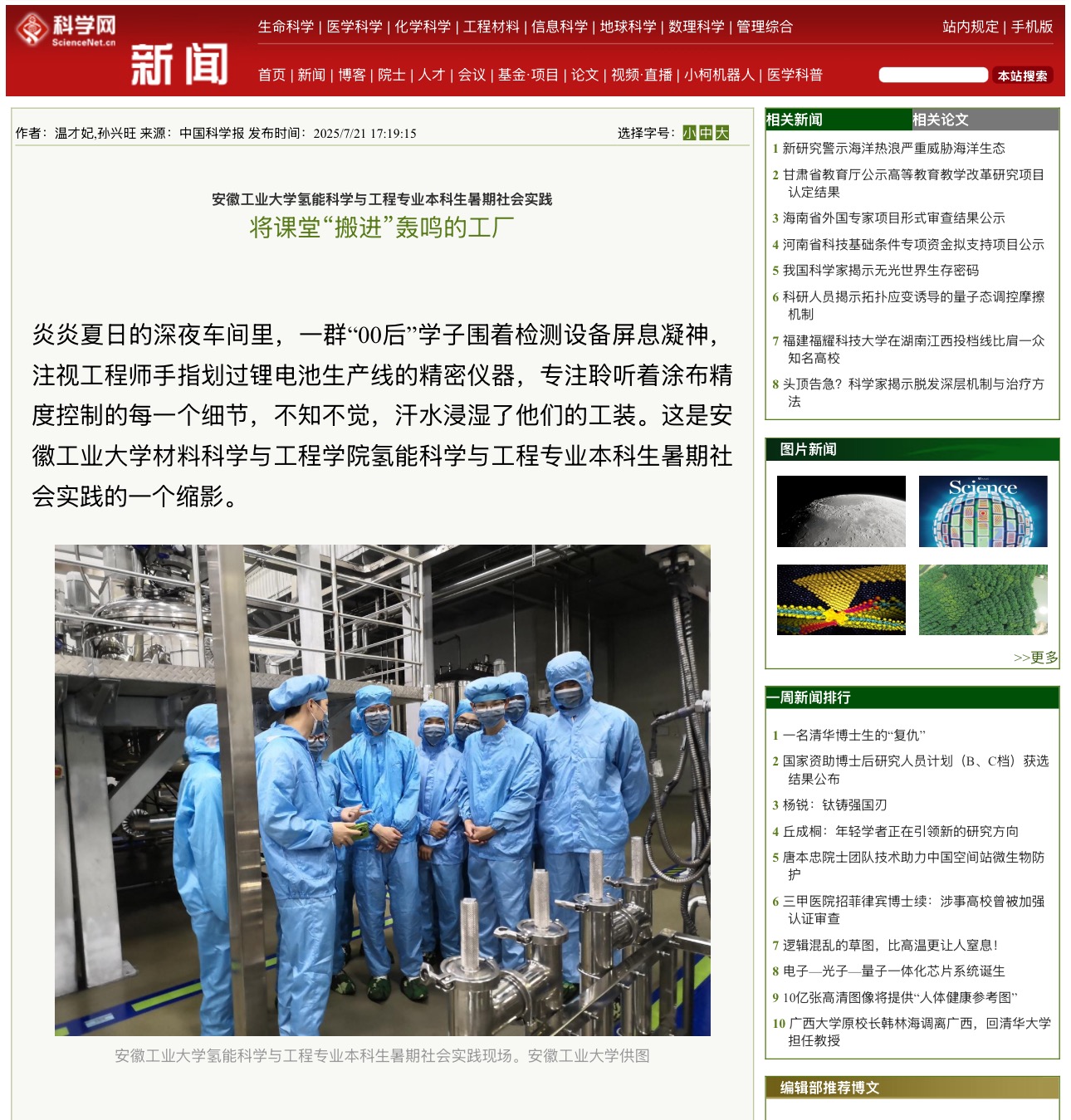 炎炎夏日的深夜车间里,一群“00后”学子围着检测设备屏息凝神,注视工程师手指划过锂电池生产线的精密仪器,专注聆听着涂布精度控制的每一个细节,不知不觉,汗水浸湿了他们的工装。这是安徽工业大学韩国三级片 氢能科学与工程专业本科生暑期社会实践的一个缩影。今年七月,该学院组织了5支社会实践队,奔走在长三角绿色科技产业一线,将课堂理论“搬进”轰鸣的工厂,用脚步丈量专业知识从实验室到产业化的真实路径。