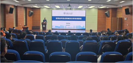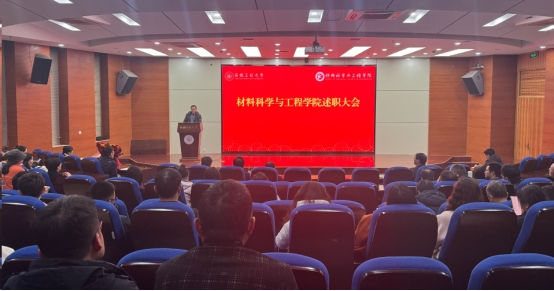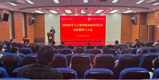 在秀山校区振华图书馆学术报告厅召开2026年第一次全院教职工大会。学院领导班子、全体教职工和学生代表参加,会议由院党委书记杨建主持,科研院院长吴宣够应邀作专题辅导报告。