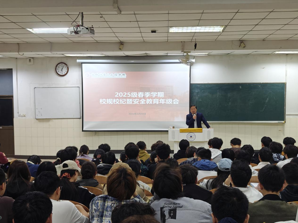 在阶教101召开2025级春季学期校规校纪暨安全教育年级会。学院党委副书记、纪委书记、副院长汪盛颜,团委书记邰子剑,新生辅导员及全体2025级学生参加会议。