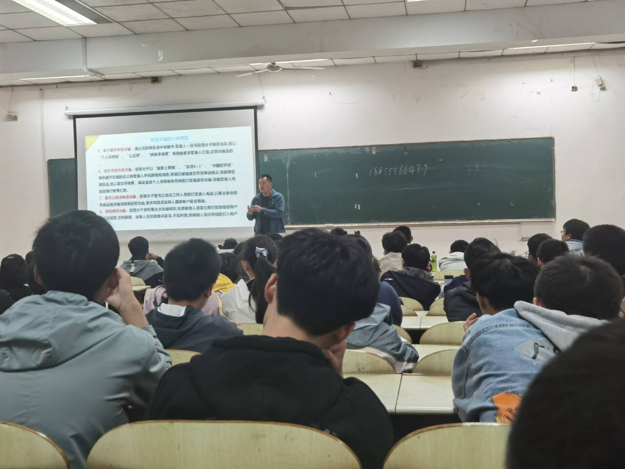 滕少聪为2020级新生讲解了什么是电信诈骗,诈骗分哪几种形式,告知同学们如何识别传销,讲述了网络贷款的案例,告诉同学们如何防范类似情况,要求学生要牢记“六个一律”、“八个凡是”。他还结合实例提醒同学们注意交通安全、食品安全、女生安全、禁止酗酒、防止溺水,警醒学生加强防范意识。最后他要求同学们注意防火、防盗,提高消防安全意识。
