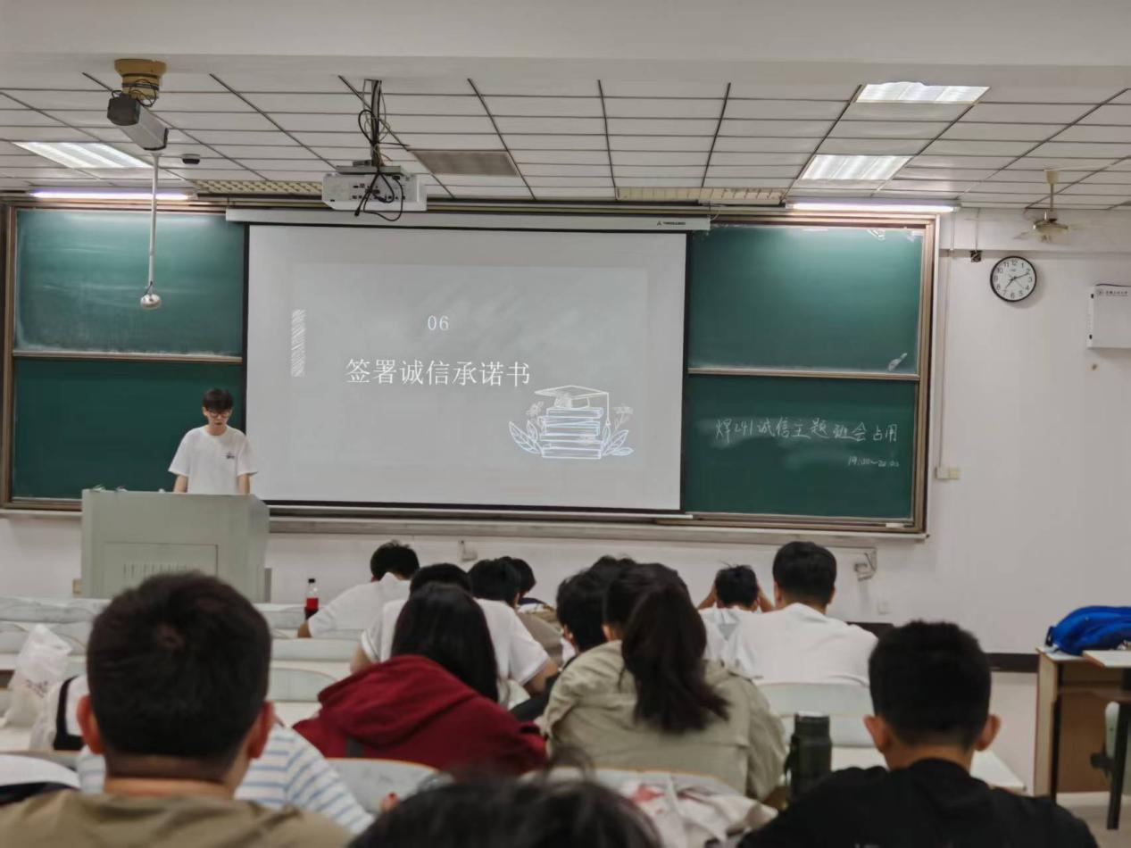 班会期间,师生围绕诚信的历史渊源、现实意义及实践路径展开探讨,并结合诚信应考、学术规范、网络诚信等热点议题进行辩论,同时学习了《民法典》中与诚信相关的法律条款。各班级通过签署《诚信承诺书》、集体诚信宣言等环节,进一步加深了学生对诚信的认知与认同。院党委副书记、副院长、纪委书记汪盛颜强调,诚信不仅是一种道德品质,更应内化为个人品格、外化为实际行动,鼓励学生在日常学习与生活中践行诚信,做到言行一致、表里如一。